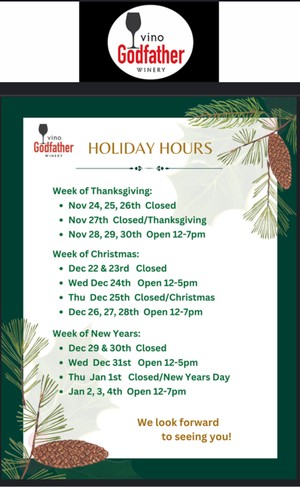 Groups of 6 or more contact our Tasting Room 707-552-2331 or info@vinogodfather.com